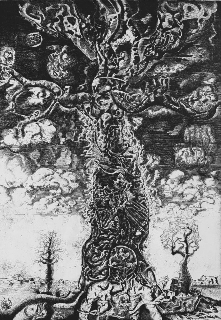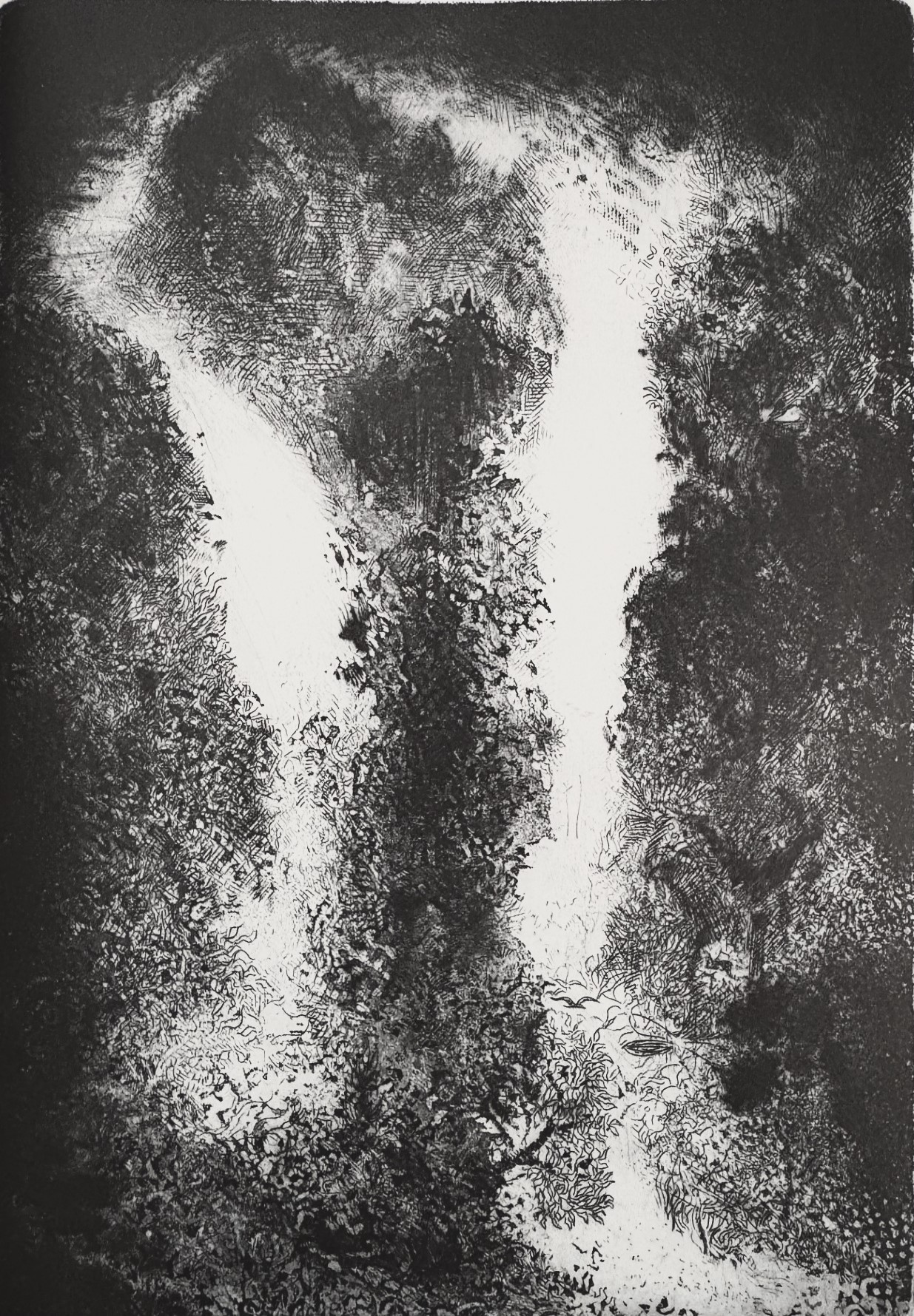 La région du Sine-Saloum constitue un milieu d’une grande singularité. Territoire deltaïque marqué par la présence de mangroves et de bolongs — ces bras d’eau qui s’insinuent entre terre et marée — le paysage y est soumis à d’importantes variations de salinité, de lumière et d’humidité. Cette coexistence d’une végétation à la fois austère et opulente a orienté la recherche de l’artiste vers des jeux de superposition, de recouvrement et d’apparition. Les végétaux déposés sur le papier deviennent des signes. Leurs silhouettes se croisent, se voilent ou se déploient dans l’espace de l’image, produisant des formes qui s’éloignent progressivement de la transcription naturaliste pour tendre vers une écriture presque abstraite.